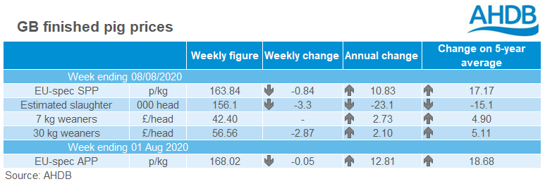 In the week ending 1 August, the EU-spec APP averaged 168.02p/kg, a slip of 0.05p on the week. The price is still 12.81p higher than the same week last year.