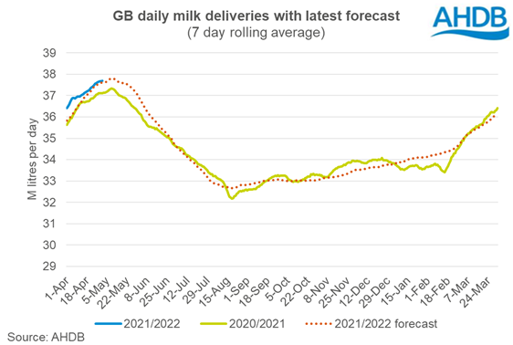 Milk production has been rising in line with the typical seasonal lift and is now likely approaching the annual peak. In 2020, GB milk production peaked at 37.63ml on 7 May. We surpassed this volume by the end of April, although this is not surprising as farmers were actively cutting back on production due to the first lockdown.