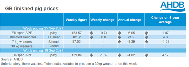 In the week ending 18 September, the EU-spec APP fell by 1.82p from the week before, averaging 159.84p/kg. This measure is now 4p lower than the same week a year ago. The gap between the APP and SPP widened to 5.53p.