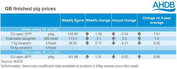 GB pig prices rose again in the week ending 3 July. The EU-spec SPP was 158.96p/kg, 1.39p higher than in the previous week. All but the heaviest pricing band showed pricing increases. Some headwinds may be starting to develop, however, with continued weakness in pig pricing on the continent. There are also reports of logistical difficulties in the supply chain, with a shortage of HGV drivers in particular.
