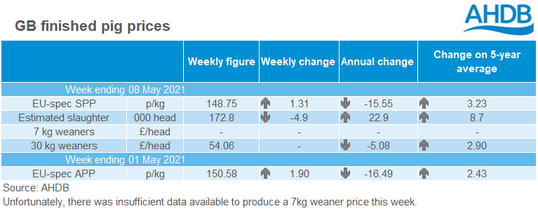 In the week ending 1 May, the EU-spec APP averaged 150.58p/kg, up by 1.90p on the previous week. This narrowed the gap between the SPP and the APP to 3.14p, this is now the closest the two prices have been since January.