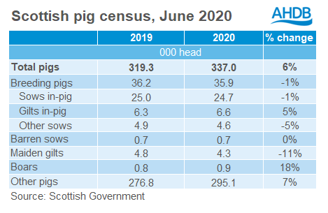 This was largely the result of a 7% increase in the number of pigs for fattening. However, at the same time, the total breeding herd apparently declined by 1% to 35,900 head. If both of these statistics are accurate, this suggests a large increase in herd performance. GB Agrosoft data for Q2 2020 only suggests a 1% improvement in herd performance, compared to Q2 2019. As with the England census, it is important to treat the year-on-year changes in these census results with caution.
