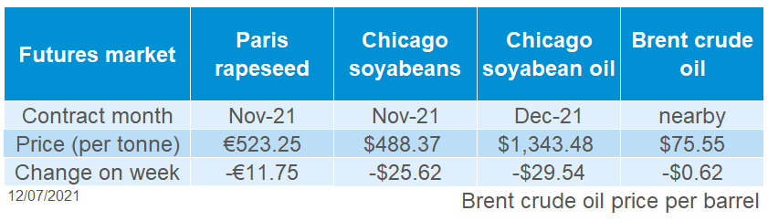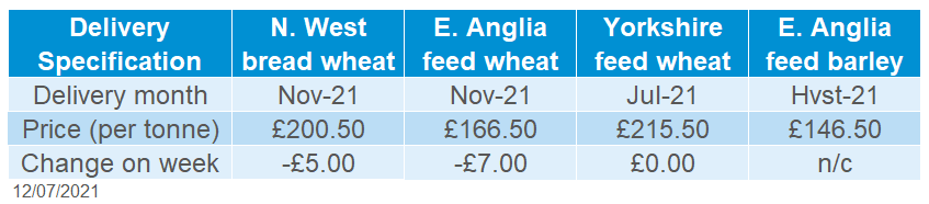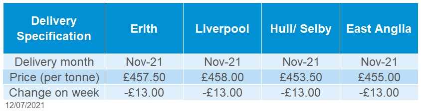 Paris rapeseed futures (Nov-21) closed Friday at €523.35/t, down €11.75/t. This pressure was captured in our domestic market, with delivered rapeseed (into Erith, Nov-21) quoted at £457.50/t on Friday, down £13.00/t from 2 July.
