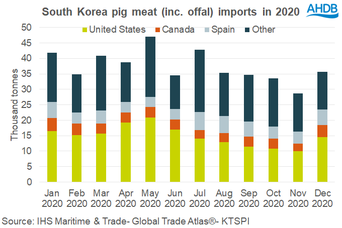 South Korea decreased the volume of pig meat (including offal) imported in 2020 by 21%, to 449,000 tonnes. Shipments from the EU were more significantly affected, falling by 28%, while trade with the US was 14% down. The level of decline was fairly consistent throughout 2020.