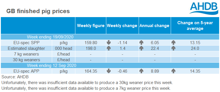 For the week ended 19 September, the GB EU-spec SPP fell by just over a penny on the week to 159.80p/kg. Prices across the continent will continue to influence producer prices here as the European market finds its feet reordering trade flows. There are indications that British spot prices remain soft, albeit steady for now.
