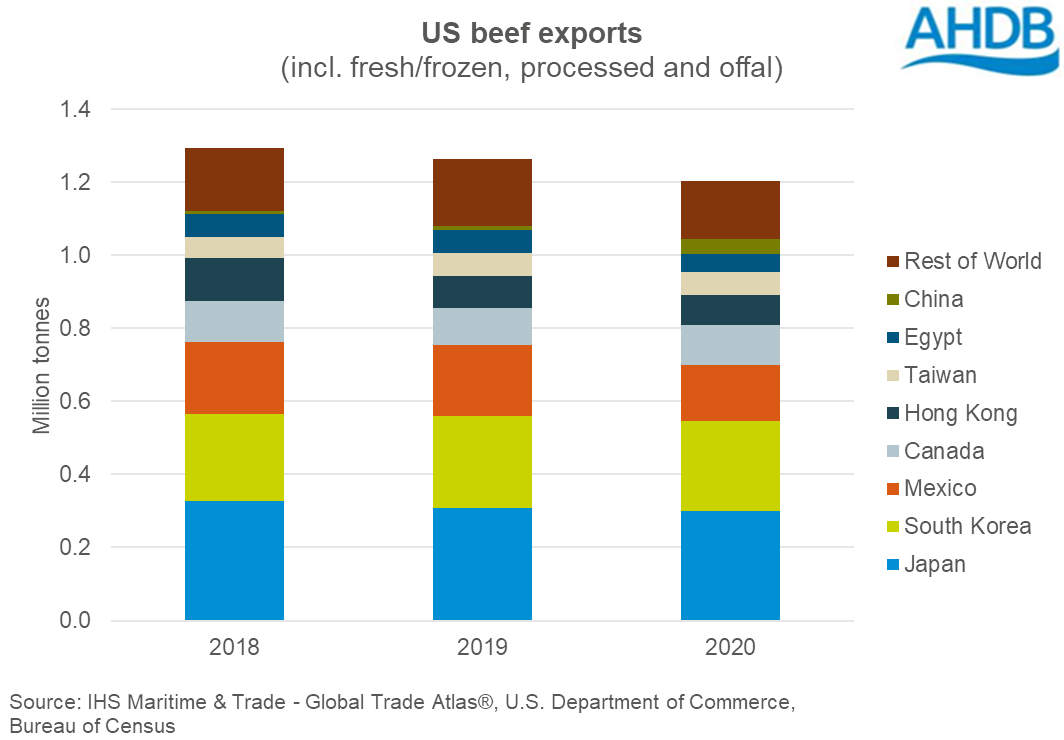 The US exported 1.2 million tonnes of beef (shipped weight of fresh/frozen, processed and offal) in 2020, down 5% (60,900 tonnes) from the year before, according to data from the US Department of Commerce. The majority of the decline was in shipments to Mexico, which fell by 20% year-on-year. Exports declined to other key destinations including Japan (-2%), South Korea (-4%), and Egypt (-23%), but to a lesser extent. Notable growth was seen in shipments to China (+30,900 tonnes; +290%), but this was not enough to outweigh losses elsewhere. The latest forecast for 2021 is that US beef exports will grow by around 6% year-on-year.