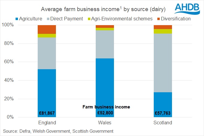 Regardless of location, direct payments (BPS) account for a significant proportion of total farm income. Scottish dairy farm businesses show the highest reliance on direct payments, where they accounted for 61% of total farm business income (FBI)[1] on average. Scottish farmers also had a larger share of total FBI derived from agri-environment schemes on average than both England and Wales.